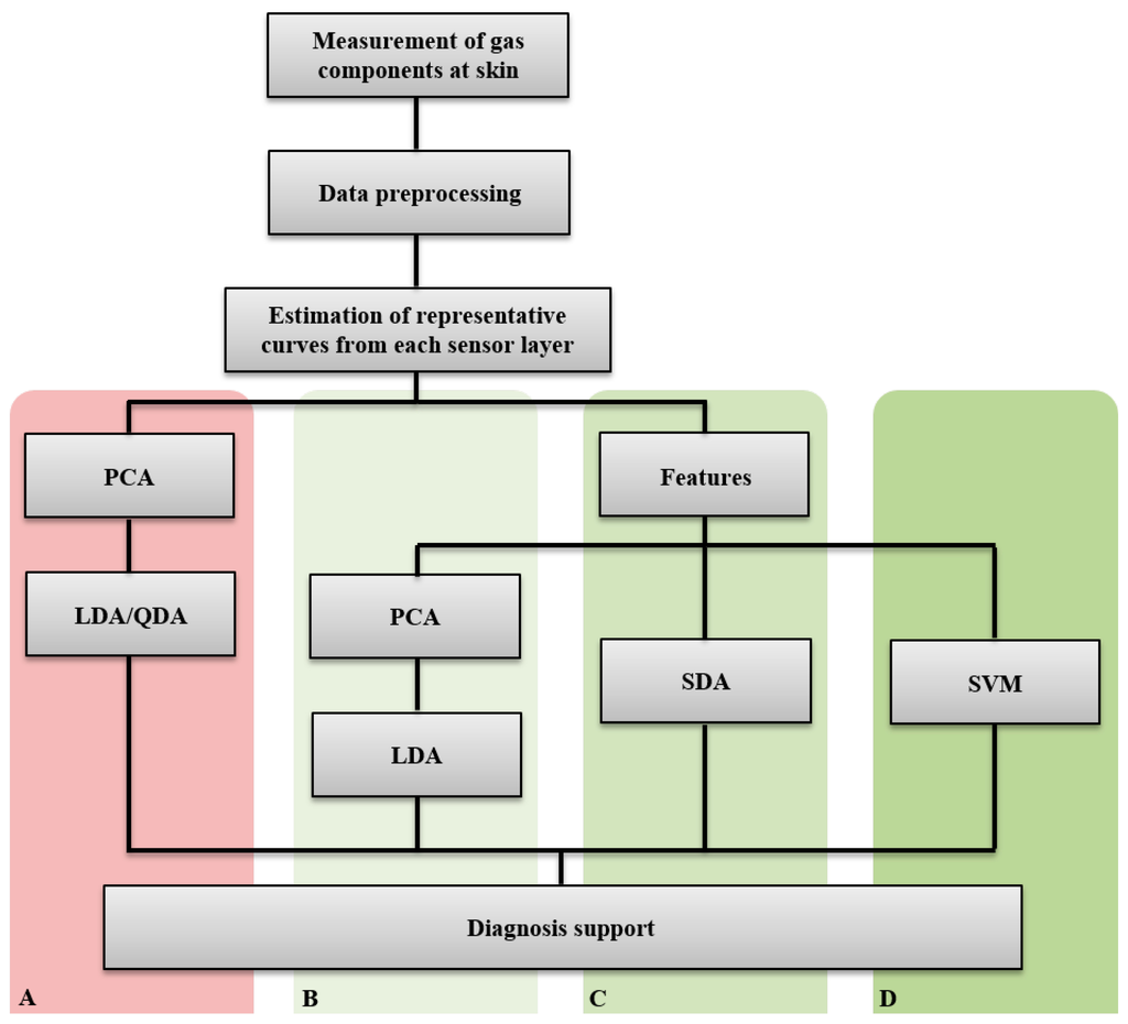 The first method A directly analyzes the three sensor signals using principal component analysis (PCA), followed by discriminant function analysis (linear -LDA- and/or quadratic -QDA-). The second method is based on extracted features (time- and frequency domains) from the sensor curves and uses as classification methods either B, PCA followed by LDA/QDA, or C, stepwise discriminant function analysis (SDS), or D, support vector machines (SVM).