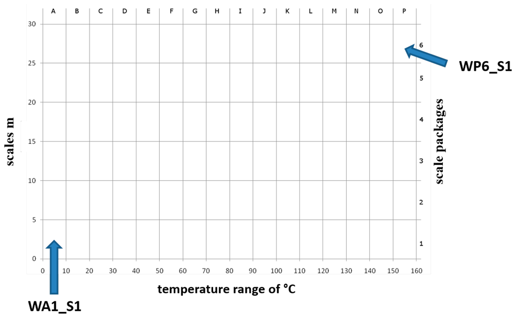The continuous wavelet transform (WT) decomposes a signal into time-frequency space [24]. It was applied to estimate frequency domain indices whereby the Daubechies wavelet was used. The scales m were summarized at a 5-scale interval and at a 10 °C temperature interval (e.g., WA1_S1: summarized scales 0–5 over a temperature range of 0–10 °C (relative degrees, absolute degrees: 195–205 °C). Figure 4 shows the resulting scaling diagram. All extracted indices are listed in Table 1.