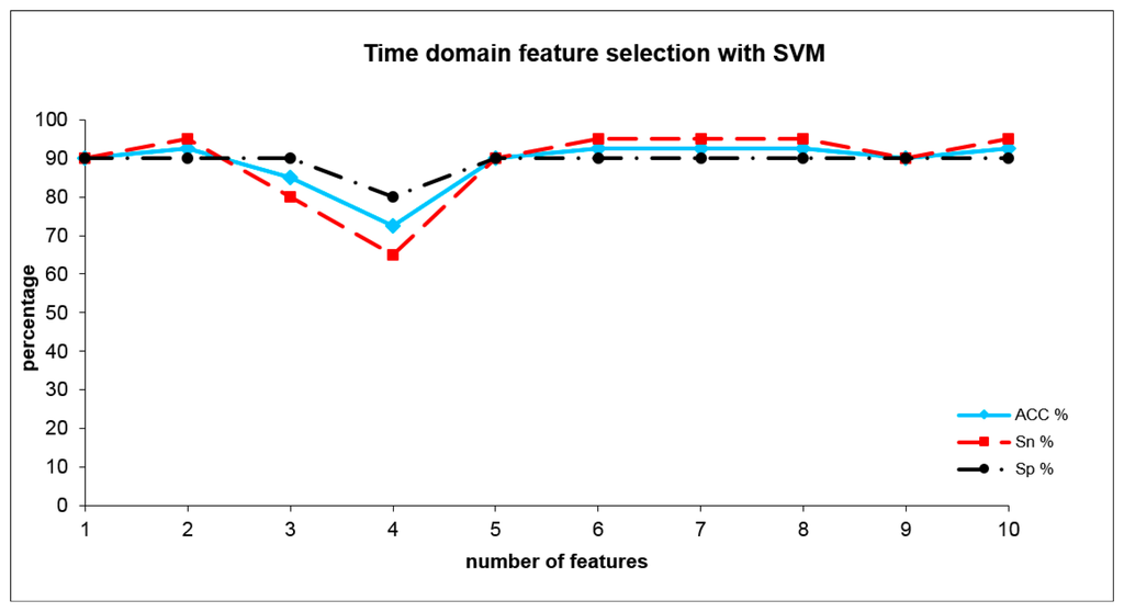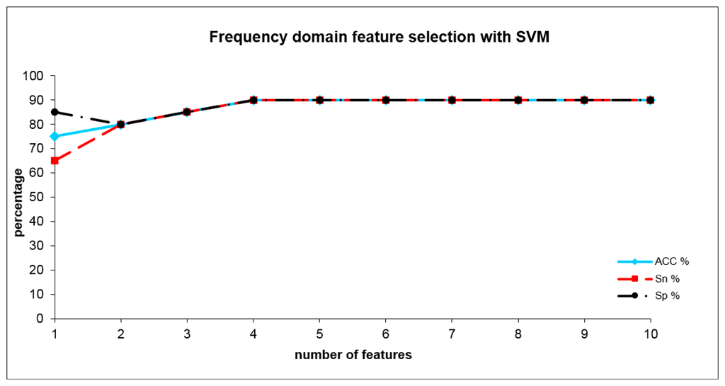 The optimal SVM adjustment parameters for the frequency domain analysis were set to C = 1 and σ = 0.05 with an error margin of 0.4. The SVM (see Table 3) reached a sensitivity of 90%, a specificity of 90% and a total accuracy of 90% with four frequency domain indices. These indices were WH6_S1, WN4_S1, WJ2_S1 and WO2_S2. Figure 6 shows the development of SVM results when the number of included indices are increased. The combination of time- and frequency domain features did not outperform the results from the time domain alone.