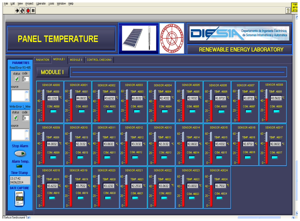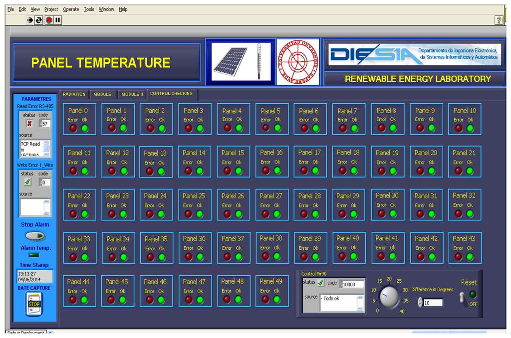 The temperature data provided by the PV facility are registered in a VI developed in LabVIEW®. This VI also records different weather variables: environment temperature, humidity, wind speed and wind direction, radiation at 35°, radiation at 90° and atmospheric pressure. Figure 9 shows the VI with the temperature data of the first 25 PV panels of the facility (Module I in the VI) on 29 March 2013, at 14:38:53. The remaining 25 PV panels are accessible through the tab Module II in the VI. Figure 10 shows a module of the VI that allows visualizing quickly that all PV panels of the system are at the right temperature, because the temperature of each PV panel is compared with its adjacent left and right one. The VI allows you to set a threshold temperature difference at which the monitoring module light changes from green to red. This is interesting for facilities where the panels are not subjected to the same environmental conditions (wind and irradiance) and, therefore, may have relatively large temperature differences, but normal between adjacent panels. Finally Figure 11 shows details (zoom) of Figures 9 and 10.