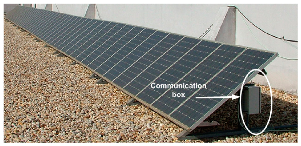 The 1-Wire bus master control software is programmed in C language and enables the communication of the connected devices. The data are sent via an RS485 bus to a building with a network connection point (Ethernet). From here (see Figures 4, 7 and 8), an RS485/Ethernet converter is used to send data over a local network or via Internet to the monitoring and control center. If this were located within the facility, the data could be dumped into a PC directly from the RS485 bus. In our facility, the box of Figure 9, is located in the building ground floor (the panels are installed on the roof of this building), specifically where the network connection point is located. The connection between the PV facility (communications box in Figure 7) and the box of Figure 8 (approximately 100 m) is performed by an RS485 bus. If the facility were located in an isolated place, without a network connection via wire, the system would be ready to operate wirelessly, via GSM. Moreover, if the facility were located in an environment without mobile phone coverage, it would always be possible to implement a solution via radio modem.