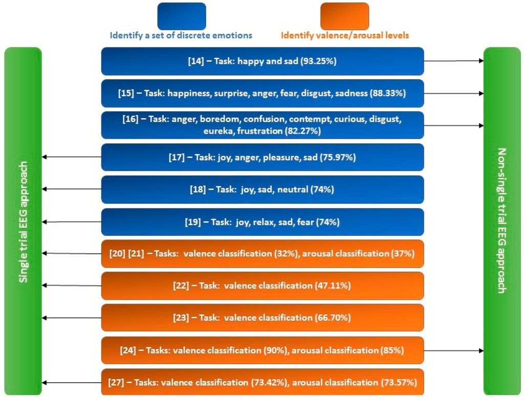 Although there are quite a few factors that can influence the EEG-ER accuracy (e.g., participants' experience, type of emotional stimuli, number of electrodes and their locations, EEG representation and classification methods), the results of previous EEG-ER methods shown in Figure 1 indeed demonstrate that: (1) non-single trial approach performs better than single trial approach, and (2) the accuracies of valence and arousal classifications are much lower than those of discrete emotion classifications on average. These up-to-date reviews therefore indicate the fact that valence and arousal classifications based on single-trial EEG signal are still challenging issues to be addressed.