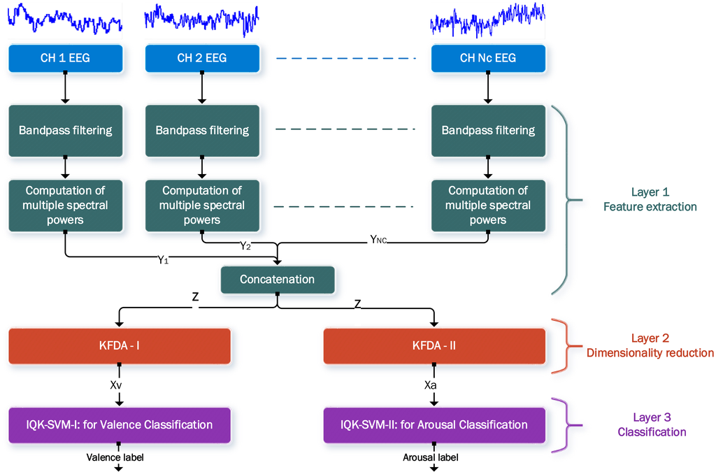 In summary, we propose a three-layer EEG-ER scheme that integrates a novel emotion classifier IQK-SVM and a new EEG feature extraction method KFEP. In the following, we provide an overview of the scheme and then formulate KFEP and IQK-SVM.