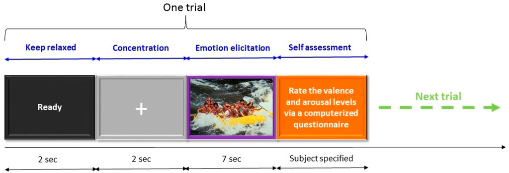 The emotion induction procedure used in this study is illustrated in Figure 4. Each trial started with a 2-s ready cue followed by a 2-s period during which participants were asked to focus on the fixation cross centered at the computer monitor with a gray-level background and try not to think anything on purpose. Subsequently, there was a 7-s emotion induction period during which one of the selected 100 IAPS pictures was displayed on the PC screen and participants were instructed to try to engage themselves into the emotion that the picture may represent. At the end of each trial, participants took a short break to assess their subjective emotional experience during the emotion-induction period in the trial using a computerized questionnaire. Note that the current experiment was a self-paced design in which participants could initiate the next trial, and they were also allowed to decide when to take a longer break. The 7-s EEG signal acquired during the emotion induction period was labeled with the self-assessment result. Namely, for the 7-s EEG signal, its arousal level was labeled as either high or low and its valence was also labeled as either high or low. The labeled EEG signal was further partitioned into two 3.5-s EEG epochs. In other words, two EEG epochs having the same valence and arousal labels were collected for each trial. Finally, participants were instructed to press any key on a keyboard to start the next trial in which a different IAPS picture was presented during the emotion induction period.