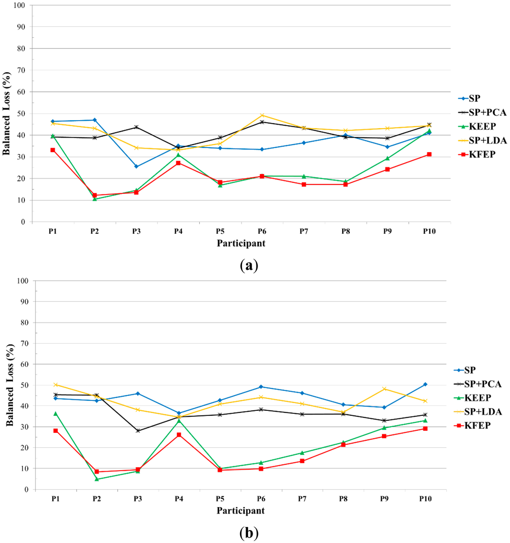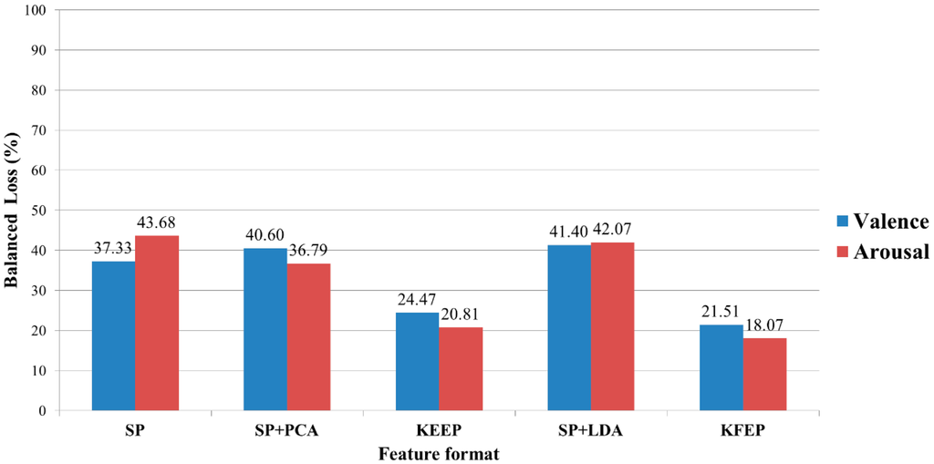 Looking back at Figure 2, we can see that the SP vector z consists of 5 × Nc spectral power values. In this study, the number of electrodes is 62, and therefore the dimension of the SP vector z is 310. Moreover, the numbers of training data for all the participants are smaller than 310. For instance, participant 1 has 76 high-valence data and 124 low-valence data. When performing the 2-fold cross validation, the training set has only 100 data (38 are positive and 62 are negative). Clearly, the number of training data is much smaller than the dimension of SP vector. In other words, LDA actually suffered from the so-called small sample size (SSS) problem [60] in our study, and therefore the performance of LDA dropped significantly. Furthermore, as shown in Figure 6, the proposed feature extraction method KFEP achieves the best results in both valence (21.51%) and arousal (18.07%) classifications, and performs much better than the traditional EEG spectral power features (37.33% and 43.68%). This comparison indicates the validity of using KFDA method to improve the discriminability of the widely-used EEG spectral powers in EEG-ER.