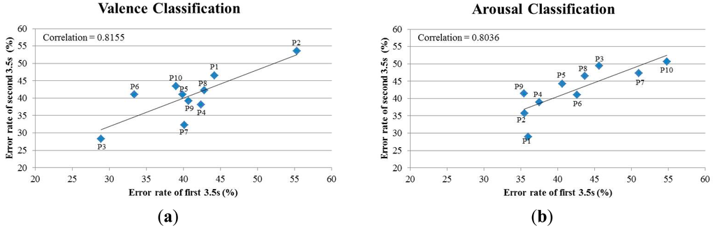 To test the reliability of the emotion-induction experiment, we apply a split half procedure to the EEG data set. We split the data set of each participant into two disjoint subsets (subset A and subset B), and each subset contains the EEG data recorded from 50 trials (i.e., the EEG induced from 50 different IAPS pictures). We test the valence and arousal classification accuracies on each subset independently by performing a leave-one-out cross validation on each subset. The results listed in Table 5 show that the classification performances of the two subsets are highly correlated for both the valence (r = 0.7711) and arousal (r = 0.8520) classifications, suggesting that the emotion-induction procedure has a high reliability. These findings also reveal that it will be possible to design an EEG-ER system that uses less emotional stimuli for classifier training.