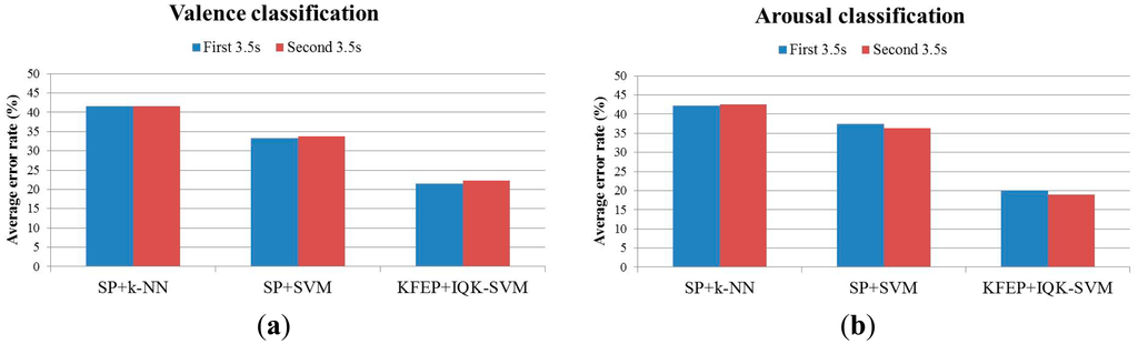We can observe from Table 6 that when SP is the feature and k-NN is the classifier, the average error rate based on the IAPS rating (43.23%) is much higher than that based on the self-assessment labeling (37.33%) for the valence classification while the average error rates for the two labeling method are very similar (IAPS rating: 43.60%, self-assessment: 43.68%) for the arousal classification. When we use SVM as the classifier, the difference between the results based on the two labeling methods become more prominent for the arousal classification (IAPS rating: 38.88%, self-assessment: 44.79%). Moreover, by comparing SP + k-NN with SP + SVM in the case of arousal classification, the IAPS-rating result is improved (from 43.60% to 38.88%) while the self-assessment result becomes slightly worse (from 43.68% to 44.79%). This could be due to fact that the EEG dataset labeled by IAPS rating is balanced while the dataset labeled by self-assessment is highly imbalanced (see Table 1): when SVM is trained with imbalanced dataset, its generalizability becomes worse. Regardless of the data labeling method, however, our proposed method (KFEP + IQK-SVM) still performs the best among all testing methods. Overall, the self-assessment labeling achieves higher classification accuracies of valence and arousal. Therefore, we can conclude here that the self-assessment procedure is more appropriate for establishing an EEG-based emotion recognition system.