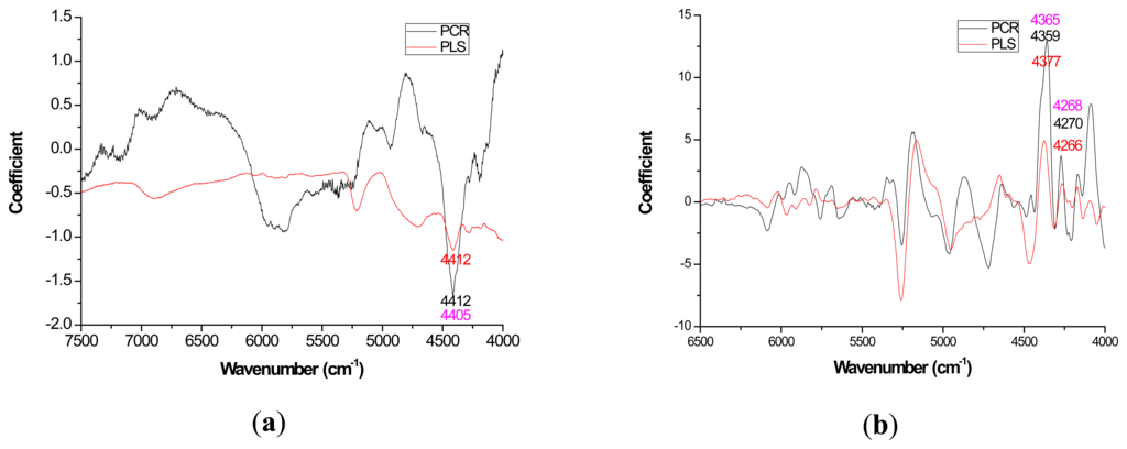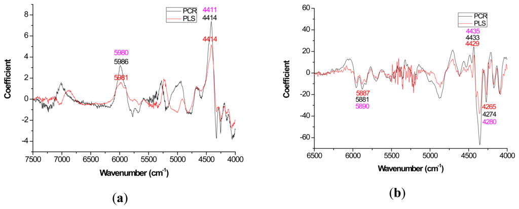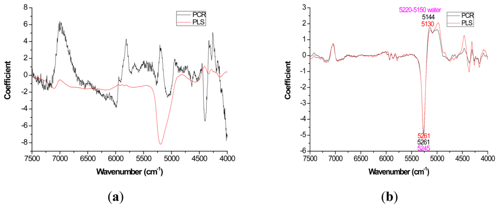 The absolute magnitude of the coefficients was higher for PCR while PLS exhibited flatter plots with perhaps the only distinctive peak occurring at 5197 cm−1 (Figure 2a). However, when the first derivative was applied, there was no visual difference in coefficient intensity between PCR and PLS (Figure 2b).