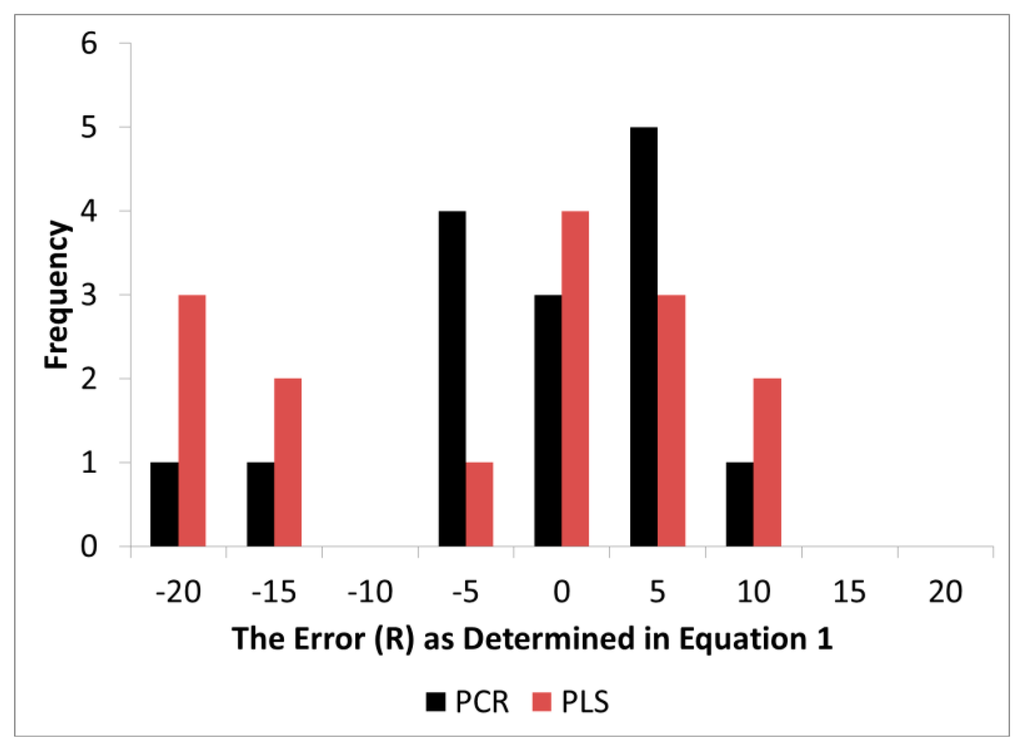 It should be noted that band assignments given above were those standard to the literature (BAL) and were chosen a priori while the loadings in the models, as anticipated, exhibited some level of error around BAL. The distribution of error (R) for both PCR and PLS exhibited a skewed pattern while PCR exhibited a distribution closer to normality (Figure 6). Visually, the error appeared to be slightly biased to one side of zero, but when a confidence interval test was performed for both PLS and PCR (α = 0.05), both overlapped with zero (Table 2). Thus statistically, both methods were still accurate for proper wavenumber selection and assignment. Nevertheless, the R (distribution of error) in PLS was higher in variance and this made it more difficult to determine if the mean differed from zero through confidence interval testing for the number of degrees of freedom available. As Figure 6 demonstrates, it is quite possible that PLS did introduce bias in loading location.