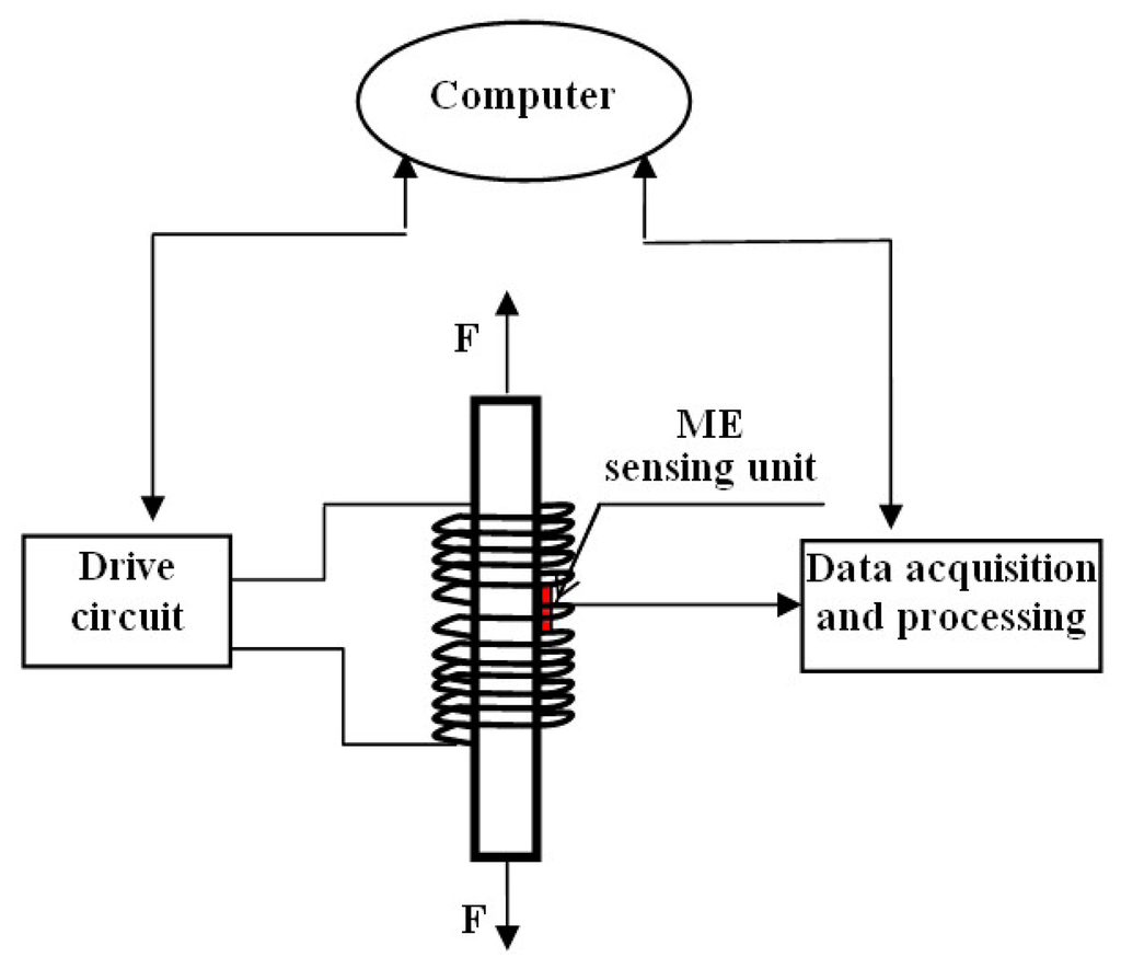 The EME sensor is mainly composed of a magnetic excitation part and a smart ME sensing unit, as shown in Figure 1. The magnetic excitation part, usually consisting of the magnetic coils and the drive circuit, provides the necessary magnetic field for the measured steel structural component and the surrounding area. The action of the stress on the steel member would result in changes in the magnetic properties (represented by magnetization intensity, permeability, etc.) of the ferromagnetic materials and thus in the distribution of magnetic field of the surrounding area, which is known as EM coupling effect. This effect mainly involves the conversion of the electromagnetic energy and mechanical energy. For the steel member under the combination of applied external stress σ and magnetic field H, the general equation of the system can be expressed as: