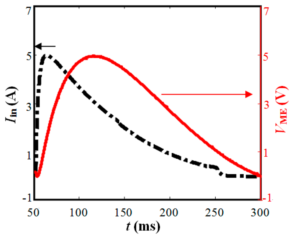 In the performance tests, the ME sensing unit displays great advantages such as high sensitivity, its self-powered nature, wide operational frequency range, fast response, and small size, etc. Its performance comparison with secondary coil and gaussmeter (PEX-045B, Litian Co. Ltd., Mianyang, China) under pulse excitation is also experimentally tested. Figure 7a plots their output signals under different input voltages. VME, m is the peak value of VME output from the ME sensing unit. Vint, m represents the peak value of the integration of the induced voltage output from the secondary coil. Vg, m is peak value of the signal from the gaussmeter. The good linearity among the three signals indicates that the ME sensing unit can be used to measure the magnetic induction. The relationship of VME, m and Vg, m is shown in Figure 7b. Compared with the hall probe connected to the gaussmeter, the ME sensing unit is of smaller size, more convenience, and higher sensitivity. Compared with the secondary coil, the ME sensing unit has a fast response (free of integration), higher sensitivity (tens of times of that using the secondary coil), small size and convenience of installation. The ME sensing unit is reliable and practical for measurement of magnetic characteristics.