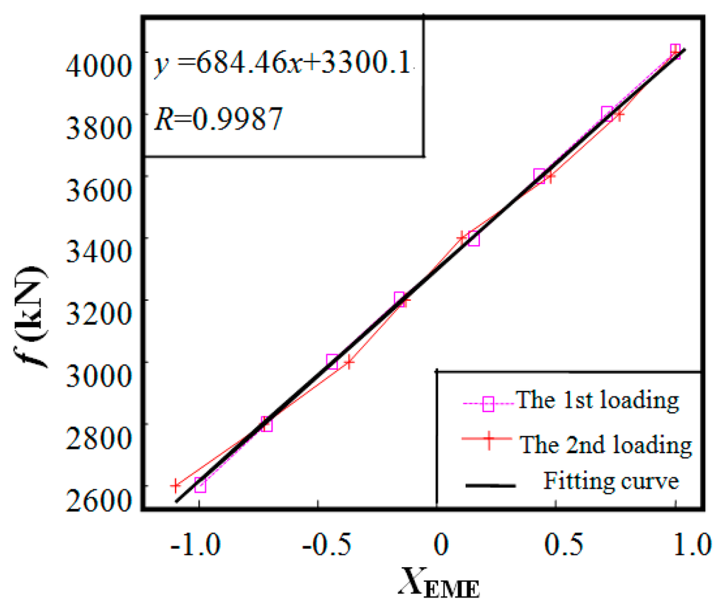 The experimental result is shown in Figure 11. The ordinate load f is the loading value indicated by the load cell for large stress state (f = 2600–4000 kN, corresponding to the stresses of 447–688 MPa). The abscissa XEME, signal output from EME sensor, is a normalized result of VME, m by setting the abscissa as 0, −1 and 1 for 3300 kN, 2600 kN, and 4000 kN, respectively. The results for the first and second loading tests are almost coincident, which proves the good repeatability of the EME sensor. As predicted by the numerical simulation in Figure 8, a good linearity between the output signal XEME and the load f is observed. A linear regression equation by curve fitting from the two loading tests is obtained as y = 684.46 x + 3300.1 with the correlation coefficient R = 0.9987.