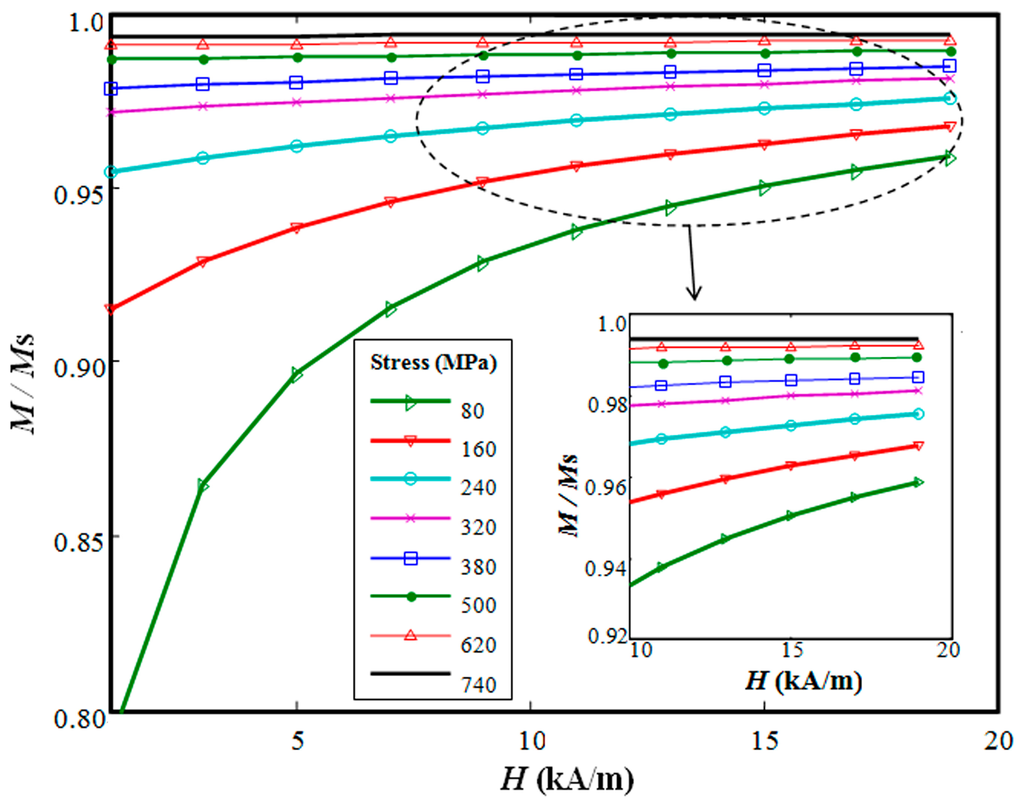 In this model, the relationship of the applied stress σ, magnetic field H, and magnetization M can be obtained by the following steps: