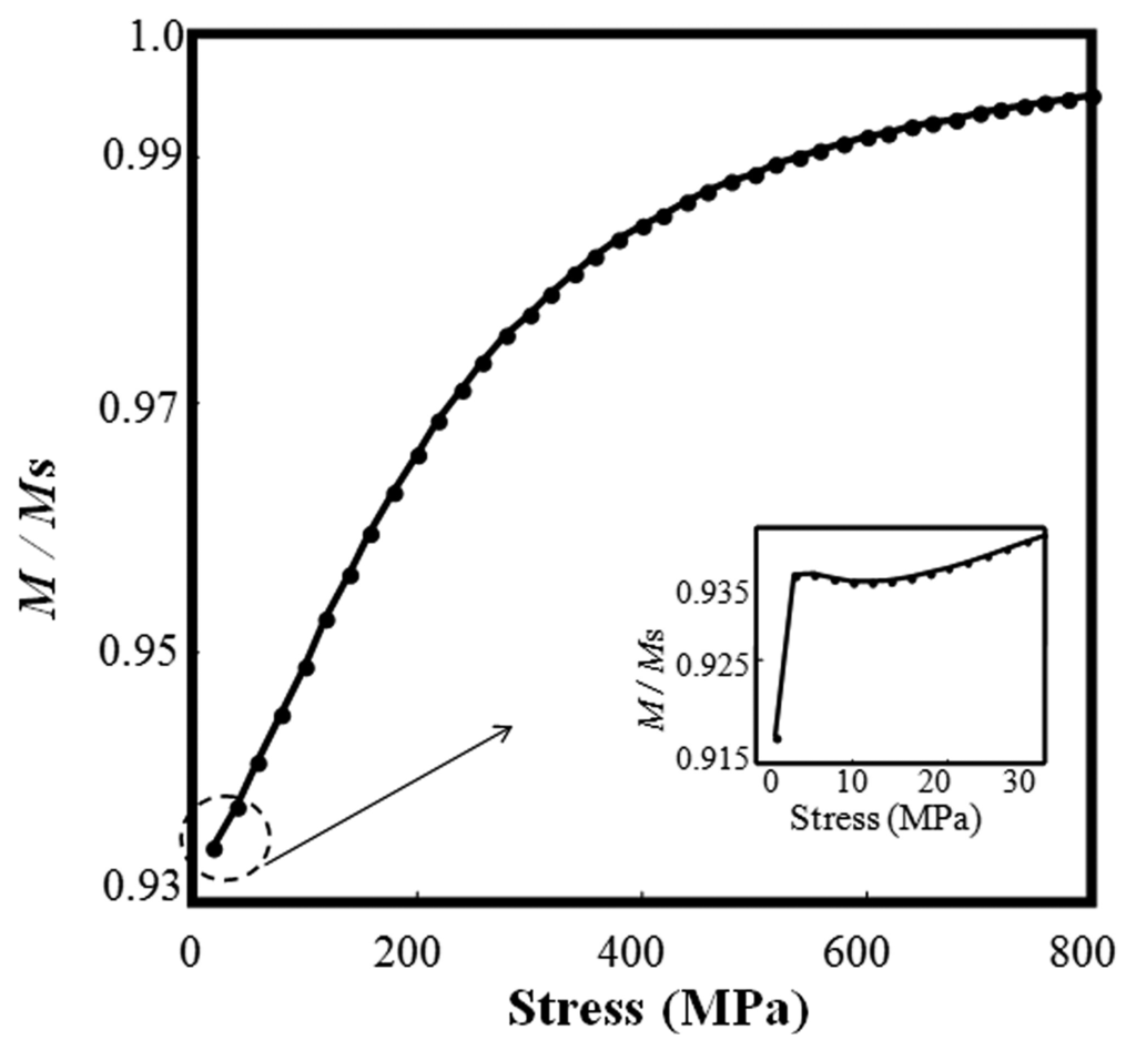 It is seen from Figure 3 that the relationship of M/MS and stress is irregular when the stress is smaller than 30 MPa as shown in the inset. This indicates that the effect of external stress on the domain wall motion has no advantage over that of the excitation magnetic field. In the larger stress stage, namely the stress larger than 30 MPa, it is noticeable that magnetization increases proportionally with the increasing external stress. This is due to the fact that the effect of external stress is much stronger than that of the excitation magnetic field on the change of magnetic properties, which can be explained from the view of magnetic domain theory [35]. The slope of the proportional relationship drops gradually with the stress increases, which may result from the increasing hindering of the domain wall motion. The relationship between the external stress and magnetic property is very useful in the non-destructive evaluation (NDE) of ferromagnetic materials.