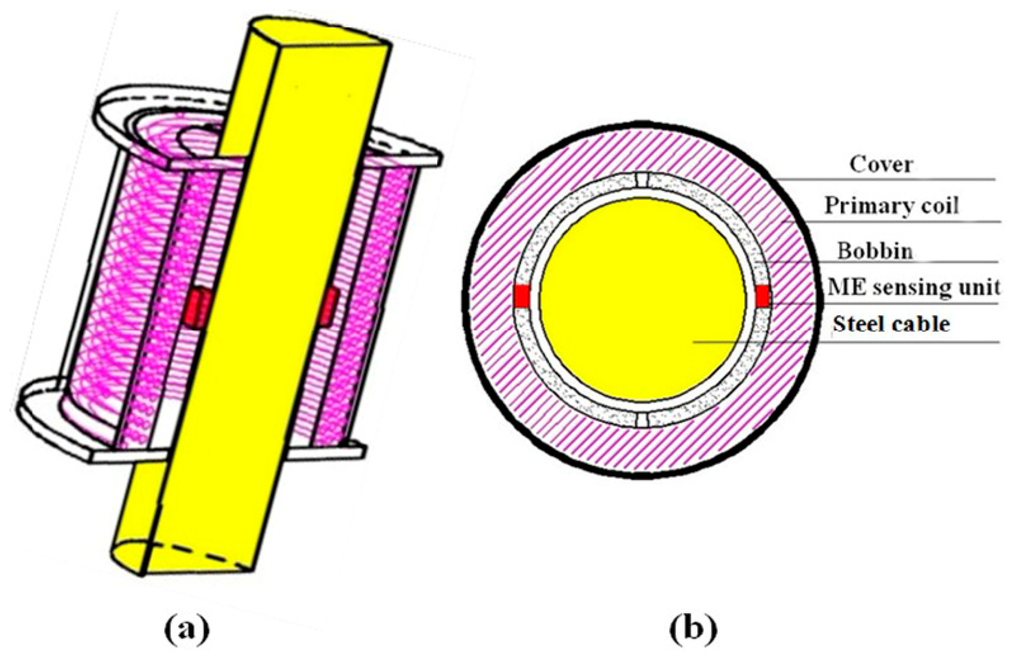Steel cables are widely used in cable supported structures such as bridges and roofs. They play critical roles in ensuring the safety and performance of the structures. Stress monitoring of steel cables thus attracted much research interest in the nondestructive evaluation (NDE) and structural health monitoring communities [1–3]. However, real-time monitoring of cable stress for the in-service structures remains a challenging task. As such cables usually contain tens or hundreds of twisting wires or strands sheathed in a plastic protective cover or a duct filled by cement grout or grease, traditional stress monitoring method by using strain gauges is inapplicable or unable to measure the actual stress (not the relative variation of stress). The vibrating frequency method [3] is based on the relationship of cable tension and natural vibration frequency. However, its measurement accuracy is affected by many factors, for example, the bending rigidity and boundary condition of the cable, the installation of damping devices, and the effect of cable poly ethylene (PE) bushing. Microelectro mechanical systems (MEMS)-based pressure sensors [4,5] work on the principle that mechanical deformation of a thin diaphragm due to the pressure exerted on its contact surface is sensed by piezoresistive, capacitive, optical and resonant methods. They are widely used for measuring local pressures in the field of auto industry and medical care. Because the MEMS-based pressure sensors are essentially deformation/strain measurement based method, they cannot realize the monitoring of the actual stress measurement of the steel cables. There are also many difficulties for the current Metal Magnetic Memory (MMM) technology [6] to quantitatively measure the stress of steel cables because the weak detection signal is easily affected by the materials, residual magnetic field and external environment. By far, its application has not been seen in stress monitoring of steel cables. Elasto-magnetic sensors are promising for stress monitoring of steel cables because of their capabilities for actual stress measurement and noncontact monitoring [7–10]. Nevertheless, the low sensitivity, low signal-to-noise ratio, slow response, and complicated installation of the elasto-magnetic sensors due to the use of secondary coil as the detecting element limit their application flexibility. An elasto-magnetic (EM) and magneto-electric (ME) effect based elasto-magneto-electric (EME) sensor has been proposed recently by the authors for stress monitoring of steel cables with obvious superiorities over traditional elasto-magnetic sensors, such as high sensitivity, fast response, and ease of installation [11,12].