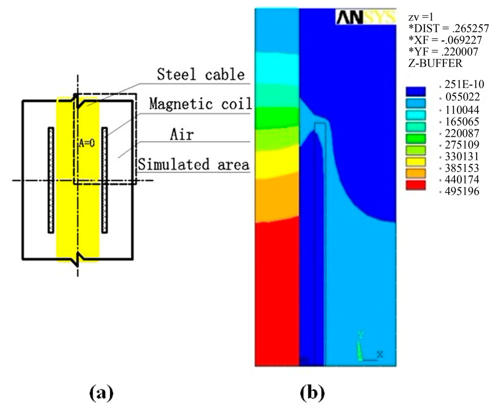 Here, the estimated magnetic induction Bz along the z-axis (axial axis) is used as the main performance criterion for the magnetic coil in the finite element analysis. Using the decoupled constitutive relation from the first Subsection 3.1, two-dimensional (2-D) transient magnetic field simulation is practical and thus conducted. To minimize the complexity of the simulation, only a quarter of the domain is modeled due to symmetry and the corresponding boundary conditions are taken as denoted in Figure 5a. The air gap, steel cable and the skeleton are modeled with PLANE53 element. The magnetic coil is modeled by using PLANE53 with the circuit-coupled stranded coil option (KEYOPT (1) = 3). CIRCU124 elements are used for creating the circuit to generate the pulse current similar to that used in the experiment. The homogeneous Dirichlet boundary condition (A = 0) is specified along the vertical symmetry axis. The Neumann boundary condition ( ) governs the nodes along the horizontal symmetry axis. Transient magnetic field simulation is solved by full-wave method. When the current is passing through the magnetic coil, its dynamic magnetic induction Bz can be simulated.