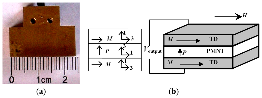 In the third subsection, the ME coupling effect of the ME sensing unit is investigated. The smart ME sensing unit is made of the Terfenol-D/PMN-PT/Terfenol-D (TD/PMNT/TD) laminated composites working in the longitudinal-transverse (L-T) mode, as illustrated in Figure 6. Owing to the great product effect of the piezoelectric effect and the magnetostrictive effect, it exhibited high magnetic field detection sensitivity, generally characterized by magnetic conversion coefficient αv. On the basis of equivalent circuit method, the developed αv is determined [27,44,45] by: