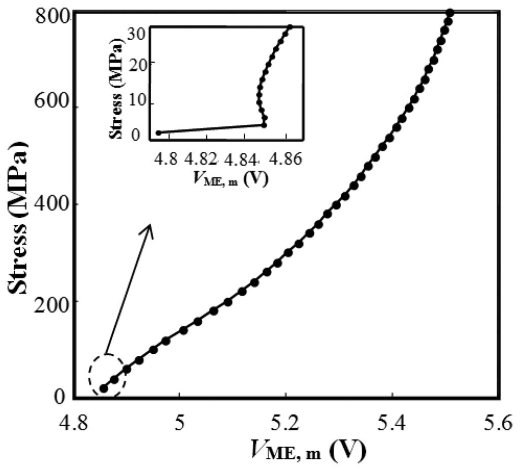 Figure 8 shows the relationship of stress and VME, m, an approximate piece-wise linearity, which is consistent with magnetization-stress relationship as in Figure 3 with a coordinate interchange. Furthermore, the changed EM coefficient DH of the modeled material directly leads to the piecewise linearity. The above model and numerical simulation indicate that the utilization of EM and ME effect based EME sensor is suitable for stress monitoring of steel components and that excellent performance can be achieved with proper design.