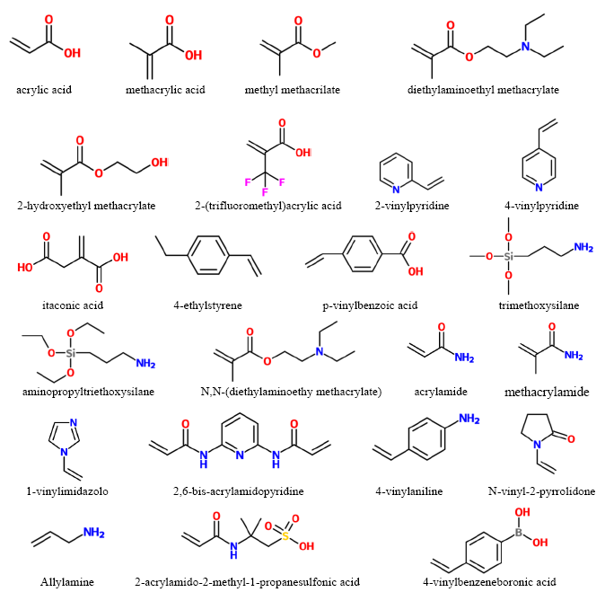 A detailed description of the different polymerization methods is beyond the scope of this review. However, it is important to highlight that free radical polymerization is usually the preferred method for preparing molecularly imprinted polymers. Methacrylic acid (MAA) and 4-vinylpyridine (4-VPY) are the most widely used functional monomers. The acrylic monomer MAA interacts via ionic interactions with amines and via hydrogen bonds with amides, carbamates and carboxyl groups. Owing to their strong force, the ionic interactions allow to obtain better performance of the MIP materials. The vinyl monomer 4-VPY is able to interact with the carboxyl functionality of template molecules. Other used functional monomers are 2-vinylpyridine, itaconic acid, acrylic acid, methyl methacrylate, 4-ethylstyrene, 1-vinylimidazole, etc. Two or more functional monomers may be also used together to improve the interactions with the template and, therefore the selectivity in recognition process. Figure 1 shows the chemical structure of some functional monomers.