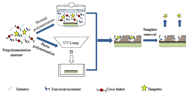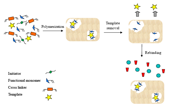 The synthesis entails the following steps: (1) the template molecules form pre-polymerization complexes with polymerizable functional monomers capable of interacting with them. In this phase, the functional monomers arrange around the template in order to create the recognition sites. (2) The pre-formed complexes are polymerized with the cross-linker molecules into a rigid polymer to maintain the location of the functional groups for binding the template. (3) After the polymerization step, the template is removed from the polymeric matrix allowing to generate the specific recognition sites which possess the molecular memory of the template. In fact, they are capable to selectively rebind the template molecules with respect other compounds, including their structural analogues. In Scheme 1, a representation of the molecular imprinting process is reported.