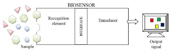 In the last two decades, biosensors have become very important tools for the detection of chemical and biological compounds for clinical [,] environmental [,] and food [] monitoring. The wide range of applications in different fields of these devices is due to their excellent high specificity, sensitivity and rapid response. Biosensors comprise a biological recognition element and a transducer to convert the biological response into a measurable signal proportional to the analyte concentration [,]. In Scheme 4, a representation of a biosensor is shown. The biological recognition elements are classified in biocatatalytic and affinity []. The former type, (including enzymes, microbes, plant and animal cells and plant or animal tissue) provides a binding between the analyte and the biological species resulting in a change detected by the transducer. The latter type (including antibodies, receptors, nucleic acids and molecularly imprinted polymers) offers selective interactions of the sample with a specific ligand to form a thermodynamically stable complex [,].