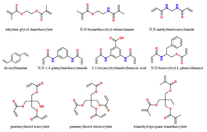 To produce molecularly imprinted polymers (MIPs) three essential elements are required: (1) the target molecule (or template) which is the substance that will be imprinted in the polymer; (2) the functional monomer which is a compound having chemical and shape complementarity to the template and will polymerize in order to form polymer matrix; (3) the cross-linking agent (or cross-linker) which is a multifunctional molecule containing two or more reactive split ends able to interact via chemical bound with specific functional groups present on other chemical substances (e.g., linear polymer chains).