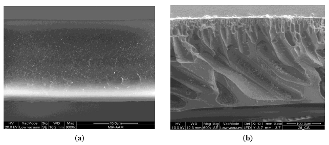 Normally, the “dry” phase inversion method allows obtaining membranes exhibiting a dense structure due to the progressive increase of the polymer concentration in the forming membrane owing to the solvent evaporation. Conversely, the “wet” phase inversion method leads to the formation of a porous membrane structure due to the quick liquid-liquid de-mixing typical of the non-solvent induced phase separation. Membranes can be prepared in a flat-sheet or hollow fibre configuration. Figure 3 shows the cross section of flat membranes prepared using the two different methods.