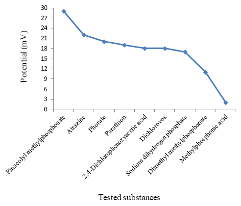 As it is evident, the higher potential response was observed in the case of PMP. Owing to the imprinting effect, the performance of this sensor (which was useful for routine monitoring of traces of PMP in ground and tap-water samples), in terms of sensitivity, selectivity and stability was superior to other sensors [].