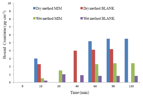 This technique was also used to develop poly(ethylene-co-vinylalcohol) (EVAL) MIMs as bio-mimetic recognition element for the detection of creatinine and to determine kidney dysfunction []. Recognition experiments, performed in aqueous solutions, showed that after ten minutes half of all binding sites were occupied for MIM and BLANK membranes synthesized by either “wet” or “dry” phase inversion. The binding of creatinine reached the equilibrium in the first hour of incubation (see Figure 6).