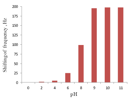 Avila et al. [] developed an on-line supported liquid membrane-piezoelectric detection device, based on a molecularly imprinted polymer manifold, as a new method for the quantification of vanillin, one of the most used flavours in foods, beverages and confectionery. The supported liquid membrane extraction technique is based on a three-phase system with an organic phase sandwiched between two aqueous phases. The organic phase is immobilized in a porous hydrophobic membrane. The analyte is extracted from a donor phase into the hydrophobic membrane, and then back extracted into a second aqueous phase used as the acceptor solution []. The separated vanillin was transferred in a piezoelectric flow cell which transmitted to a frequency counter and the finally recorded the signal. The desorption time after vanillin absorption did not exceed 10 min, which is an acceptable time for sensors. The use of a supported liquid membrane coupled on-line to a quartz crystal microbalance based on an imprinted polymer enhances selectivity by avoiding interference from matrix constituents. Owing to the hydrogen bonding, as well as electrostatic interactions and charge transfer in the template-functional monomer (methyl-methacrylate) bond, the pH had great influence on the sensor response. As shown in Figure 7, an increase of pH from 1.0 to 9 allowed also an increase of the frequency signal. At pH value ranging from 9 to 11 the frequency signal was almost constant, indicating that the system was stabilized [].