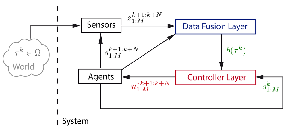 Our solution to the MTS problem is the autonomous and intelligent system abstractly represented in Figure 1 as a perception-action loop [31]. Its general processing structure, similar to the one in [8,11,32], consists in two interacting layers: (1) the data fusion layer that is in charge of calculating the target state belief b(τk) with the measurements provided by the agents' sensors; and (2) the controller layer that has to compute the optimal joint sequence of actions using the data fusion layer's target state belief b(τk), the agents location , and the target transition and observation models, i.e., P(τk|τk−1, ϵ) and