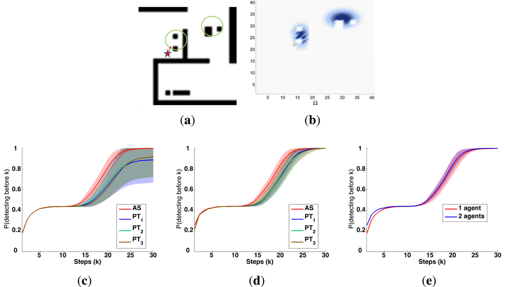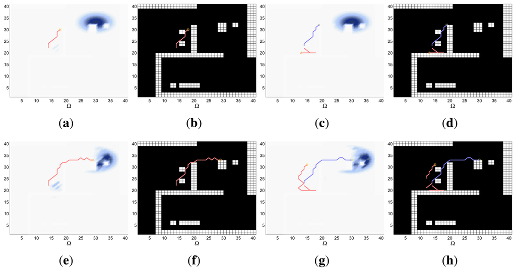 - Lanillos, P.; Yañez Zuluaga, J.; Ruz, J.J.; Besada-Portas, E. A Bayesian Approach for Constrained Multi-Agent Minimum Time Search in Uncertain Dynamic Domains. Proceedings of the Fifteenth Annual Conference on Genetic and Evolutionary Computation Conference (GECCO ′ 13), Amsterdam, The Netherlands, 6–10 July 2013; ACM: New York, NY, USA, 2013; pp. 391–398. [Google Scholar]