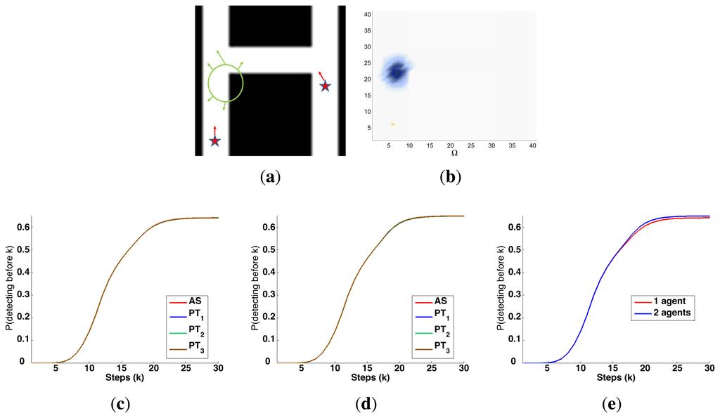 The general case is derived through Equations (A16)–(A20). First, Equation (A16) shows the definition of f(τk+j) and Equation (A17) uses MR to include the variable τk+j−1 in the probability function. Next, Equation (A18) exploits BR to separate the transition model from the rest and Equation (A19) applies again BR to separate the probability of the no-detection measurements at k + j − 1 from the rest. Finally, Equation (A20) assumes that the no-detection measurements at k + j are independent on each other given given the agent and target τk, considers that the joint probability of the no-detection measurements from k+1 to k+j − 2 and of the target state at k+j − 1 is independent on the agent state at k + j − 1, and redefines as f(τk+j−1).