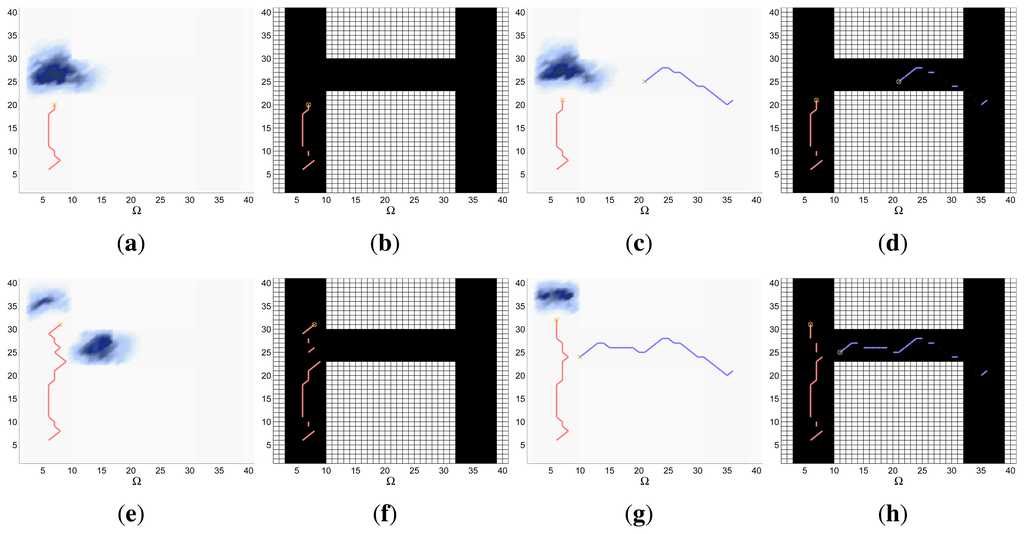 There are several reasons that make the experimental setup of this section harder than the presented in the previous one. On one hand, the ultrasonic scanner likelihood, represented in Figure 3, is a complex model that presents a smooth decreasing behavior over the valid range of the sensor when the structure of the environment permits it and a different behavior, originated by the occlusive objects of the map, over the different locations of the space Ω. On the other hand, not only the objects of the map affect the target belief (through the dependency of the the target transition and sensor models on the map), but they also restrict the possible agents movements to cells without known objects. Therefore, for this experimental setup we need to incorporate some of the usual ways to handle constraints in optimization problems, such as including the constraints in the utility function [51–53], penalizing the objective function value of the unfeasible solutions [54] or using searching strategies capable of only generating valid solutions [55]. In this case, we use the two last approaches, implemented as an: