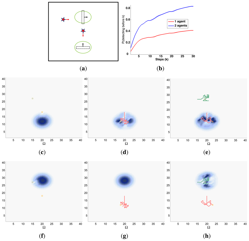Alternatively, it is possible to exploit the inner characteristics of the MTS problem, to reduce the complexity of its formulation as a POMDP, and then solve it with an adapted strategy. Some characteristics to be considered are (1) the deterministic behavior of the agents; (2) the binary detection/no-detection nature of the sensor model; and/or (3) the fact that in the definition of some of the search detection-based utility functions (such as the probability of not detecting the target during the decision plan and the expected time to detect it) only the no-detection measurement event appears naturally. Examples of this strategy are presented in [17] and [32]. In the first, [17], the author exploits the first two facts to maximize the probability of detecting the target during the decision plan by optimizing, using an adapted exact POMDP technique which is only valid for problems with small state spaces [44], a value-function defined over the target belief b(τk) and a single-agent state . In the second, [32], the author focuses on the third fact to take out the expectation over the possible measurements in the POMDP utility function associated to the probability of not detecting the target during the decision plan. He goes a step further, and instead of optimizing the problem with an adapted POMDP algorithm, he does it directly with a gradient-based method. In other words, although he defines the search problem as a POMDP, he finally uses a deterministic optimization method to tackle it.