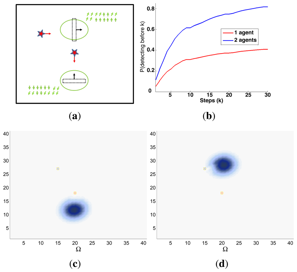 is the measurement taken by the sensor placed at agent i at time step k. In the discrete space MTS problem, we only consider two possible observations: detection D and no detection D̅. To simplify the expressions, we will also represent as and as