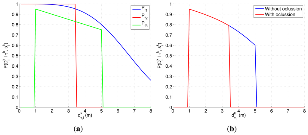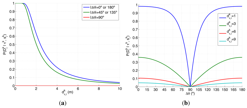 The ultrasonic scanner detection likelihood is defined with Equation (12). It combines the effects of the three behaviors modeled with the probability functions Pf1(·), Pf2(·) and Pf3(·). The first, Pf1(·), corresponds to the detection likelihood model of an active sensor in free space without occlusions. Indeed, we use the expression of an active radar when the reflecting element has a Swerling 1 RCS [46–48] to model the sonar behavior in free space, by setting the values of its parameters to make it work in the sonar detection range, because it is simpler that Equation (7) and matches better the behavior of a generic object with multiple scattering surfaces. The second, Pf2(·), models the occluding behavior of the static elements objl in the map, which eliminate any probability of seeing the object when any of them is placed in the Line Of Sight (LOS) between the target τk and the robot . Finally, Pf3(·) is used to model the working range of the sonar [δmin, δmax] and the existence of other unexpected objects. Objects placed closer than δmin are not detected because that locations are associated with the period of time after the emission of the signal where the sensor is off to avoid detecting the emitted signal directly. Objects placed at bigger distances that δmax are ignored to reduce the effects produced by the existence of multi-path reflections. The existence of unexpected objects is modeled, inspired by the sensor error model presented in [50], as a decreasing linear function of the distance under the assumption that unexpected objects can appear suddenly in any position of the space with the same probability. Therefore as the distance of the object under search grows, there is a smaller linear probability of detecting it because the number of unexpected objects in between increases. In other words, the decreasing parameter β is associated with the probability of the appearance of unexpected objects.
