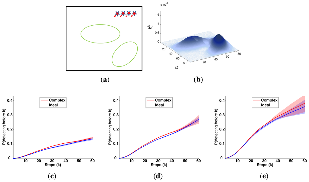 The promising properties of the ET-CEO based solution have only been tested in [12] with ideal sensors with a binary (0/1) probability of detection model a streamlined sensorial model (where the probability of detection is zero whenever the agent does not observe the target, and one otherwise) that appears also in other formulations of the search problem [17,25]. In fact, simplified sensorial models are commonly used in other solutions of the search problem that are closely related to the ET utility function, because they simplify the problem formulation and/or are required by the selected optimization method. For example, stepped detection probability functions with zero/constant probability outside/inside the observable region are used in the entropy-based utility function presented in [11], and continuous differentiable distance-based detection probability functions are employed in the joint detection-probability function used in [8,21,22,24]. Therefore, the evaluation presented in this paper of the ET-CEO-based method with several complex models will provide additional information of (1) the applicability of the method to complex sensorial models and of (2) the possibility of using CEO as the optimizer of other related utility functions without simplifying the sensorial models of the system.