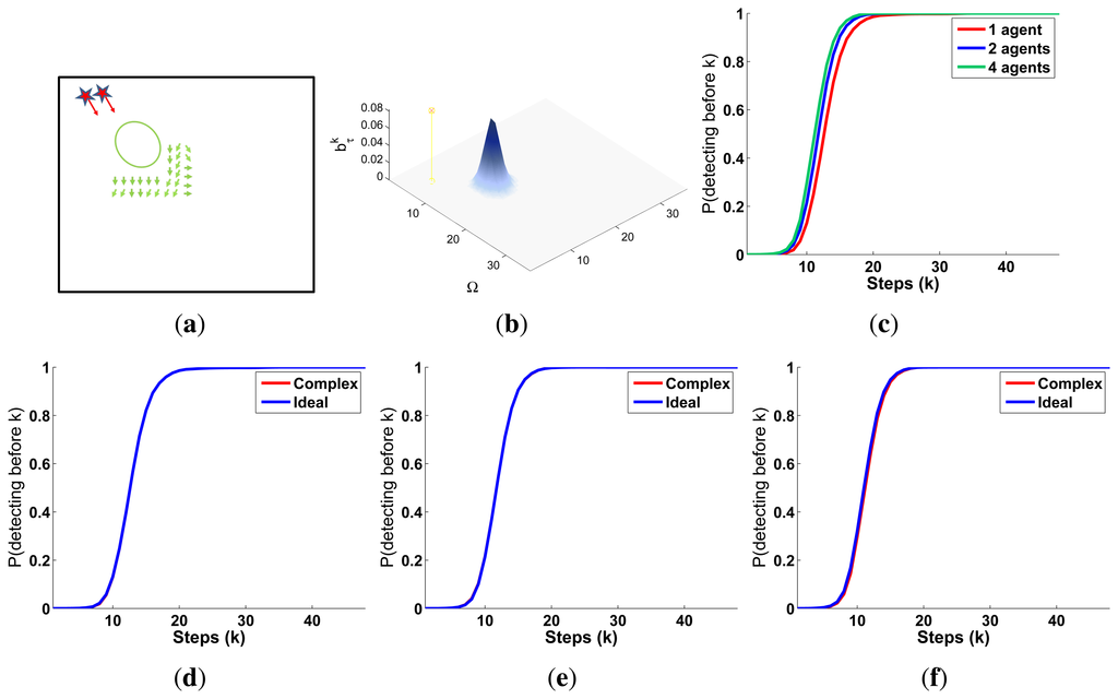is the sensor likelihood or probability of detecting the target given the target τk, agent and environment ϵ states. The probability of not detecting the target is defined as and is complementary to the sensor likelihood, i.e., . As we assume that the measurements of each agent are independent on the information of other agents, the sensor model shows no dependency of on any other (j ∈ {1 : M} − {i}) agent state or measurement .