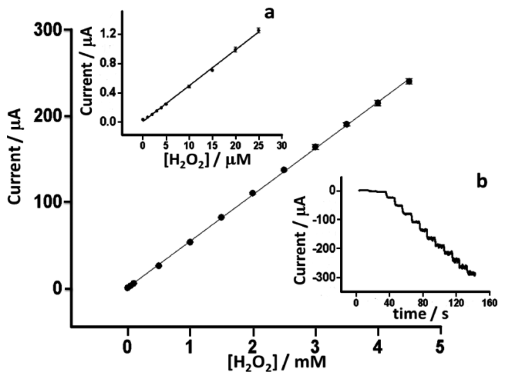 The effective measurement of hydrogen peroxide remains a critical analytical goal due to its widespread use in various fields such as food processing, the textile industry, pulp and paper bleaching, pharmaceutical research, clinical chemistry, antiseptic and disinfecting agents [1–3]. H2O2 is also involved in several biological events and intracellular pathways and is the by-product of enzymatic processes such as those involving, for example, glucose oxidase, cholesterol oxidase and alcohol oxidase. H2O2 is also a substrate for the enzyme horseradish peroxidase [4]. Reliable, accurate, sensitive, rapid, and cost-effective determinations of H2O2 continue to be widely investigated.