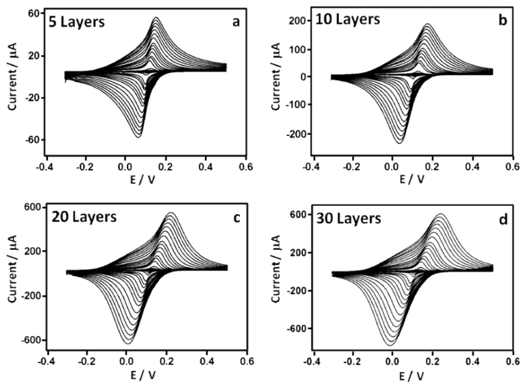 The effect of the quantity of PBNPs deposited onto the SPEs on the electrochemical properties of the sensors was investigated by performing different numbers of prints. Electrodes were modified with 5, 10, 20 and 30 layers of the PBNP solution. Cyclic voltammetric analysis of the sensors was performed in 0.05 M phosphate buffer containing 0.1 M KCl (pH 7.4) at scan rates between 10 and 1000 mV vs. Ag/AgCl in the potential range from −0.3 V to 0.5 V (Figure 4). A pair of redox peaks can be seen which are due to the oxidation and reduction of Prussian blue in which the PB is reduced to PW which is re-oxidized to PB. PB is known to exist in both a soluble and insoluble form, according to the following reactions, respectively: