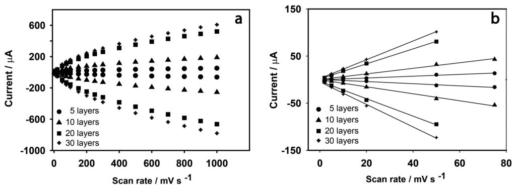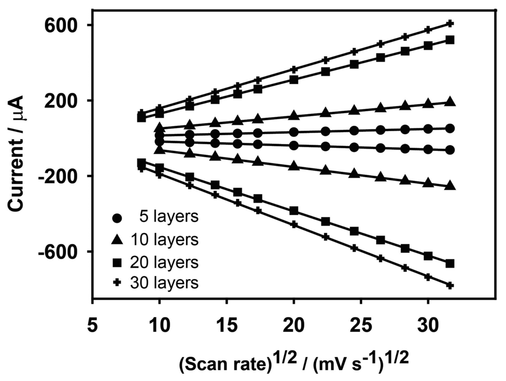 Anodic and cathodic peak currents were also related to the number of deposited layers. Ip,a values were 1.11, 7.10, 18.9 and 22.1 μA and Ip,c values were 0.99, 5.901, 17.8 and 18.0 μA for 5, 10, 20 and 30 layers, respectively. Anodic and cathodic currents may vary linearly with scan rate (v), or by v1/2, depending on whether electron transfer processes are surface confined, or whether they depend on diffusion. Figure 5 shows the dependency of the peak current responses of the electrodes on scan rate across the entire scan rate range, and in detail between 0 and 80 mV·s−1, while Figure 6 shows the dependency of Ip to v1/2. This demonstrates that, for fewer layers of PBNPs (5 or 10 prints) at lower scan rates, currents increase linearly with v and suggest a surface controlled process [28], while for thicker films or at higher scan rates, peak currents were proportional to v1/2 due to the fact that the electrochemical process was controlled by diffusion of the counter ion, K+, in the lattice. Table 1 shows the anodic currents and slopes at 50 mV·s−1 for different numbers of deposited layers of PBNPs. This data suggests that, while peak current increases with layer thickness, little gain was achieved by moving from 20 to 30 layers, between which, there was also relatively little difference in their electron transfer rates. As a consequence, sensors fabricated with 20 layers were selected for further work.