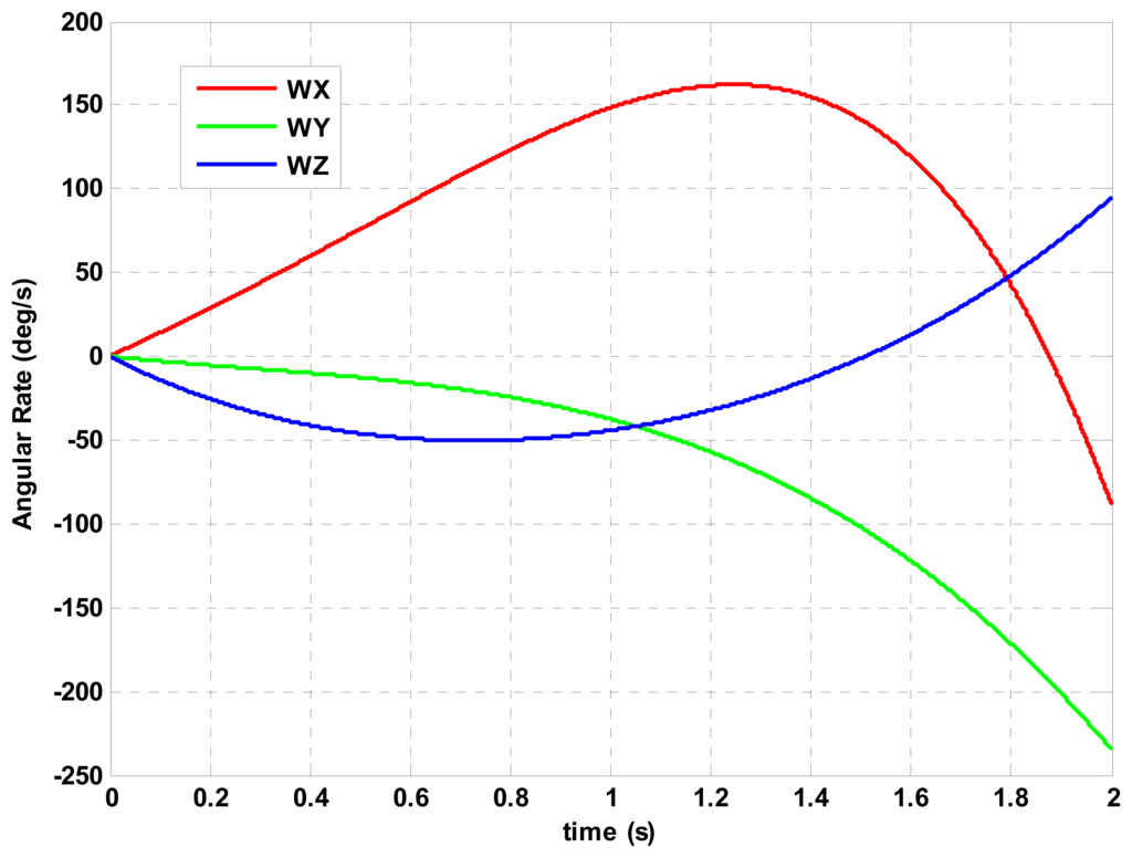 The maneuver environment set for algorithm accuracy evaluation is the extreme 2 s angular rate profile pictured in Figure 2 with M = 5, = [0 0 0]T, = [19572/143 −4360/143 −21800/143]T, = [1007/41 4000/143 9369/67]T, = [4843/155 −4000/117 −9206/213]T and = [−5813/131 − 625/858 3258/281]T in Equation (10). The dimension is deg/s for s. According to Equation (13), the maneuver error vector em (t) is computed for the compressed algorithms, the half-compressed algorithms and the uncompressed algorithms with Tables 5, 6, 7, 8, 9 and 10 coefficients over the Figure 2 maneuver profile.