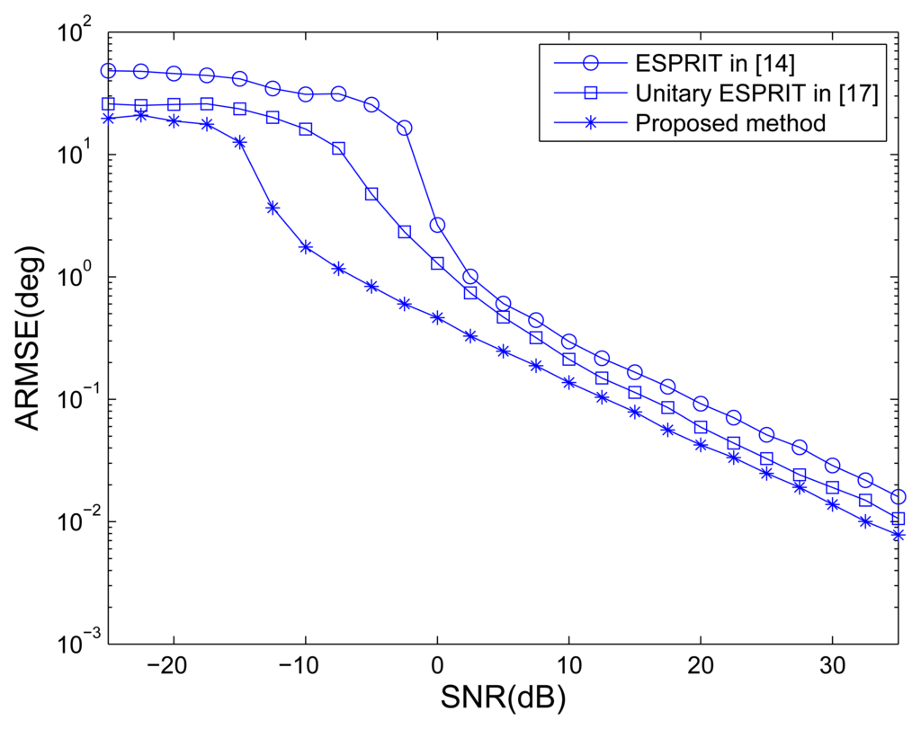 In order to analyze the complexity for the computation of the proposed method, we have to know the complexity of the SVD algorithm, which is the main computational burden. Since the computational complexity of the SVD is varying with different methods [20]. Among them, an efficient orthogonal iteration approach for SVD algorithm has a complexity in order of O(MNr) for an M × N matrix truncated to rank r. Based on this point, the main computational cost of the ESPRIT method in [15] is O (M2N2P). Different from the MN × MN complex-valued covariance matrix in the ESPRIT method, the covariance matrix of the unitary ESPRIT in [17] with the same size MN × MN is real-valued.Since the complexity of complex-valued computation is higher than that of the real-valued, the computational complexity of the unitary ESPRIT in [17] is O(μM2N2P), where μ < 1. The computational complexity of our method is O(μM2K2P), which is approximately equal to unitary ESPRIT in [17] and lower than ESPRIT in [15].