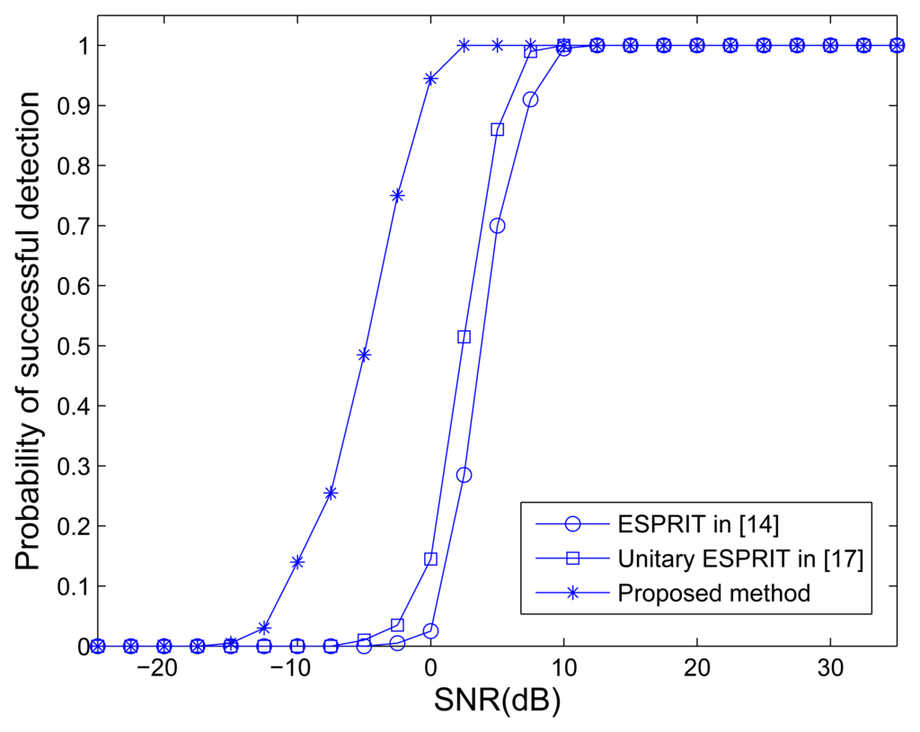 The traditional MIMO radar employing ESPRIT [15] and unitary ESPRIT [17], and MOTS MIMO with K = 3 OTSs employing our method are used to compare. Figure 2 shows the ARMSE of angle estimation of different methods versus SNR, where L = 40. It can be seen that the traditional MIMO radar employing unitary ESPRIT has better performance of angle estimation than ESPRIT. It can also be observed that the traditional MIMO radar employing ESPRIT and unitary ESPRIT provide worse accuracy performance than the MOTS MIMO employing the proposed method. The MOTS MIMO radar has the smaller effective aperture as the traditional MIMO radar but higher SNR per virtual element due to transmit coherent processing. It yields the comparative advantage of the proposed scheme over traditional MIMO scheme, especially at lower SNR region. Figure 3 shows the probability of the successful detection of the different methods versus SNR. The absolute errors |φ̂p − φp| ≤ 0.5° and |θ̂p − θp| ≤ 0.5° are both required for the successful detection of DOD and DOA for all three targets. It can be seen from Figure 3 that all the methods exhibit a 100% successful detection at high SNR values. As the SNR decreases, the probability of successful detection starts dropping for each method at a certain point. The SNR level at which the transition happens is known as the SNR threshold. It also can be seen that MIMO employing ESPRIT and MIMO employing unitary ESPRIT have the highest and the second highest SNR thresholds, respectively. In contrast, the proposed method has the lowest SNR threshold, i.e., the best probability of the successful detection.