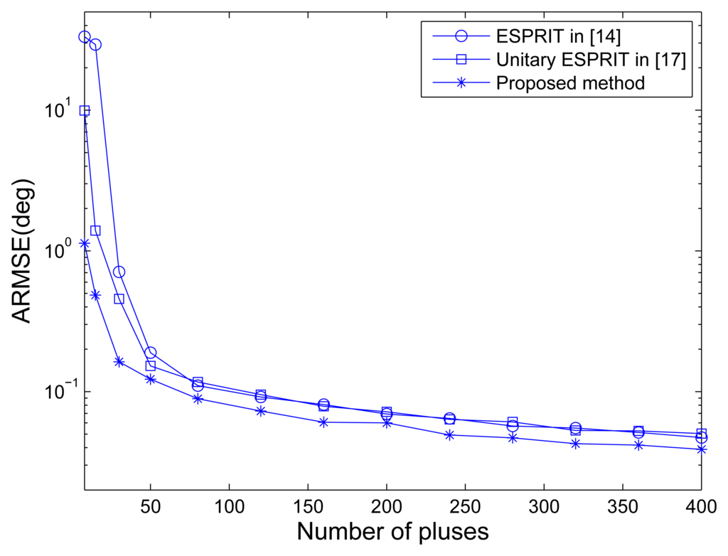 Figure 4 shows the RMSE of angle estimation of different methods versus the number of pulses under SNR = 10 dB. It is indicated that the unitary ESPRIT has better angle estimation performance than the ESPRIT in traditional MIMO configuration especially in small pulse number case. The performance improvement is lost for large pulse number, and this may be caused by the averaging of the number of pulses without SNR improvement. The MOTS MIMO employing the proposed method has the best performance of angle estimationin all pulse number cases, mainly due to the SNR improvement per virtual element via transmit coherent processing.