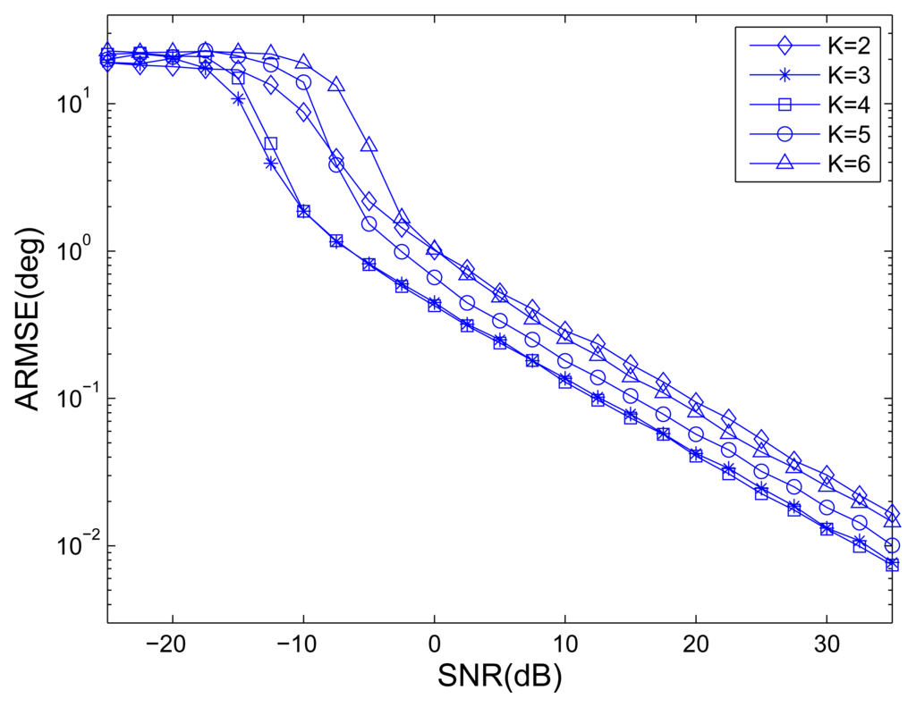 For different numbers of OTSs, Figure 5 shows the ARMSE of angle estimation of MOTS MIMO employing the proposed method versus SNR , where L = 40. Note that if K = 1 is chosen, the whole transmit array is considered as one subarray and only one waveform is emitted, there is no estimation of DODs. When K = 6 is chosen, the MOTS MIMO becomes the MIMO radar without subarray partitioning, which has largest effective aperture but no transmit coherent gain. It can be easily seen that the angle estimation performances are the best when the number of OTSs is equal to 3 or 4. It is the fact that effective aperture becomes larger with an increase in the number of OTSs K while SNR gain per virtual antenna becomes lower. It is the combination of effective aperture and SNR gain per virtual antenna that has an impact on the estimation performance. It also can be observed that the MOTS MIMO with K = 3 slightly outperforms the MOTS MIMO with K = 4 at low SNR region while the opposite occurs at high SNR region. This means that having high SNR gain per virtual antenna is more important at low SNR region, while having large effective aperture is more important at high SNR region. Thus, K is chosen as the tradeoff between effective aperture and SNR gain per virtual antenna.