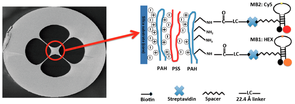 The immobilization of two types of MBs on the surface of the SCF core was carried out following the procedure detailed in our previous publication [18] using a combination of the fuzzy nanoassembly technique [20] and the biotin-streptavidin binding mechanism [21]. An in-house made pump system was used to flow the required solutions through the SCF air-holes for deposition of different immobilization layers. Typically one end of SCF was immersed in solution vial placed in a sealed chamber and the other end was left free outside of the chamber. A pressure difference between the inside and outside of the sealed chamber was created by a pump connecting to the chamber, forcing the liquid to move from inside to outside through the SCF air-holes. Since the SCF surface is partly negatively changed by OH− groups on the surface, positively charged poly(allylamine) hydrochloride (PAH, 2 mg/mL in 1 M NaCl solution, Sigma Aldrich) and negatively charged poly(sodium 4-styrene sulfonate) (PSS, 2 mg/mL in 1 M NaCl solution, Sigma Aldrich) were deposited alternately onto the fiber core surface using the layer by layer deposition technique described in [20], ending with a PAH layer (PAH/PSS/PAH). The PAH provides amino groups for immobilization of biotinylated MB through a biotin-streptavidin-biotinylated MB link [21]. The flow time for each polyeletrolyte layer was 20 min, followed by extensive rinsing using deionized (DI) water. NHS-LC-Biotin (0.5 mg/mL, Thermo Fisher) was prepared freshly and flowed through for 1 h, followed by extensive rinsing using phosphate buffer solution (PBS, Sigma Aldrich) to remove unbound biotin on the surface. Non-specific blocking solution (Candor) was flowed through the fiber for 2 h and rinsed by PBS. Streptavidin (0.5 mg/mL, Thermo Fisher) was flowed though for 40 min at room temperature then left inside the air-holes overnight and then rinsed thoroughly with PBS. In this case Streptavidin only binds to Biotin rather than non-specifically deposition on the SCF surface thanks to the use of non-specific blocker. A biotinylated MB solution containing a mixture of two different MBs (2.5 μM for each MB, Midland Certified Reagent Company Inc.) was flowed through for another 1 h, rinsed with PBS and DI water and then dried with Nitrogen for 15 min. The functionalized fiber was cut into several pieces of 65 mm length each for measurement. Figure 1 shows the cross section of the SCF used in this work and a sketch of the final state of the SCF core surface after immobilization. The SCF was a silica glass SCF made in-house with a core diameter of approximately 13 μm and has four air-holes. We chose to use a relatively large core SCF principally to ensure high optical coupling stability during the fluorescence measurement. Despite the large core diameter, we found that the dual-type MB immobilized SCF presented in this work can detect DNA solution whose concentration of as low as 100 nM. If one desires to increase further the sensitivity of the sensor, a smaller core size should be used, however, at the expense of coupling instability. In this case, advanced fiber processing techniques such as well-optimized fusion splicing are required to ensure good optical coupling stability [22,23].