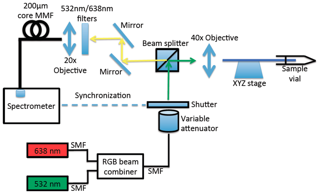 A schematic diagram of the measurement setup for fluorescence measurement of the dual-MB immobilized SCF is shown in Figure 2. Two lasers operating at two excitation wavelengths corresponding to HEX and Cy5 dyes have been used. Excitation lights from a 532 nm laser (Crystal Laser) and a 638 nm laser (Toptica) were first combined by a RGB fiber beam combiner (Thorlabs), power-adjusted by a variable attenuator (a pair of half-wave plate and polarizer), and then directed to the SCF using a beam splitter and a 40× microscope objective. The same microscope objective and beam splitter also serves as the collecting objective for the backscattered fluorescence from the fiber. Backscattered light was directed through a system including mirrors, a filter (either 532 nm or 638 nm filter depending on what MB signal is being interrogated) to block the residual pump light, and coupled to a large core multimode fiber using a 20× microscope objective. The multimode fiber guides the backscattered light to a spectrometer. A shutter that was synchronized with the spectrometer was placed after the output of the beam combiner. The consistent mode coupling in each measurement was achieved by means of maximizing the power transmitted through the SCF core. It should be noted that Cy5 dye is known to have photoswitching characteristic [24], i.e., exposure of Cy5 under continuous wave laser light at 638 nm turns the dye into a dark state, which then can be switch back to a fluorescent state with 532 nm exposure [25]. Therefore when maximizing light coupling to the SCF core, the green laser (532 nm) was mainly used, followed by a weak red light (638 nm) beam to check the power coupling to the SCF core for the red wavelength. The continuous red light exposure of the immobilized SCF was typically 3 s to minimize the potential photoswitching effect on the Cy5. In the measurement of fluorescence enhancement upon filling the immobilized SCF with DNA solution, the green laser was always used first. In this way the green light was used both to excite the fluorescence from HEX dye as well to reactivate the Cy5 dye to a fluorescent state, in case it might have been photoswitched to a dark state, even by the weak red beam.