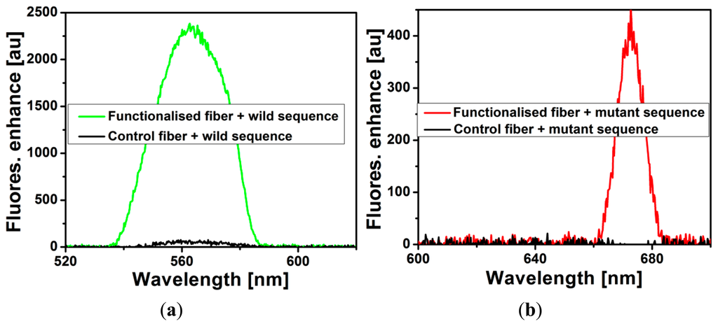 Another SCF that serves as the control fiber was put through the same immobilization process as described in Section 2, except that the biotin-streptavidin linking step was omitted. The two fibers, dual-type MB immobilized fiber and the control fiber, were loaded with solution containing either wild-type or mutant-type sequence with a concentration of 100 nM and the fluorescence were measured. In this work the functionalized was not optimized for any specific concentration as the functionalization involved multiple coating layers which makes optimizing the probe surface density difficult. In principle, detection in a biosensor is based on the binding between functionalized probe (molecular beacon in our case) and analyte suspended in the solution under test and therefore there should be an optimized pair of probe density on the sensor surface and analyte concentration. As can be seen in Figure 3, it is clear that the two MBs are successfully immobilized on the surface of the SCF core through the biotin-streptavidin link as the fluorescence of the MB immobilized fiber increased significantly upon hybridizing with target DNA while that of the control fiber remains approximately unchanged. This indicates that without the intended biotin-streptavidin link, biotinylated MBs cannot form a stable chemical attachment to the fiber surface and are removed when rinsed. The use of the non-specific blocking layer helps to ensure that biotinylated MB binds only to the surface through the biotin-streptavidin link and not directly to the surface due to physical adsorption, which would be too close to the surface and thus might be associated with high steric hindrance.